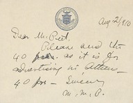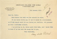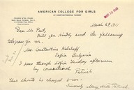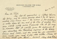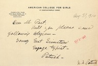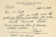 Primarily includes correspondence with William Peet concerning administrative affairs and accounts in Constantinople. It also includes correspondence addressed to Mary Mills Patrick from Herbert Adams Gibbons concerning property acquisition in Arnavoutkeuy.
