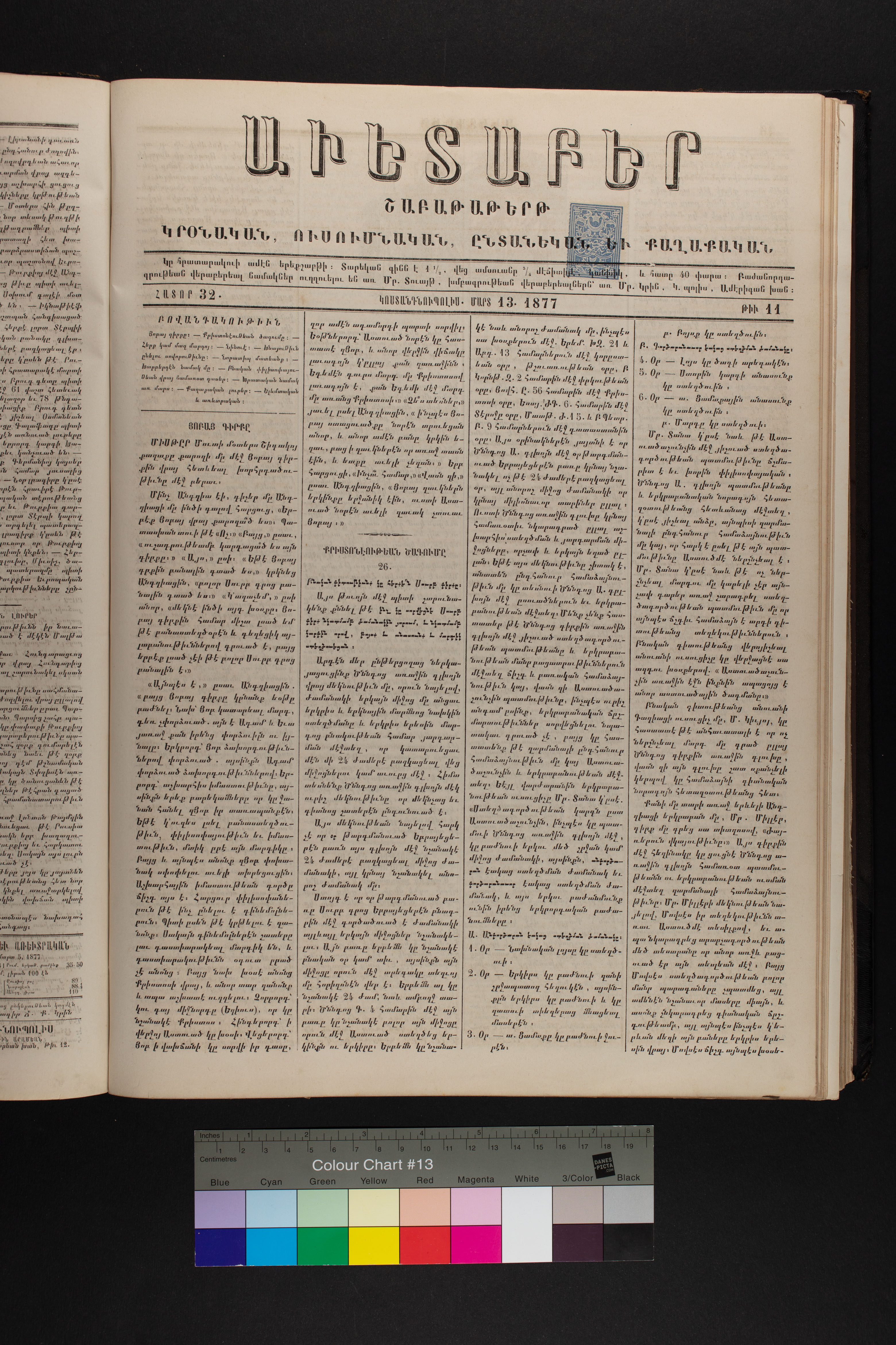 Volume 32 (1877) of Avedaper primarily contains articles on Christian religious subjects, ethics, and morals, especially related to the Protestant faith. It reports about happenings and events in the Ottoman Empire’s Armenian Protestant community and includes letters to the editor from contributors located in various cities and towns in Anatolia, as well as obituaries. Information about the activities of the American Board of Commissioners for Foreign Missions, its personnel, and its schools and other institutions is also presented. It covers local and international political news and includes feature pieces on foreign lands, which offer information about regional history, politics, society, religion, and mission work. It also includes items on a wide range of topics of general interest, such as health and nature, as well as market prices.