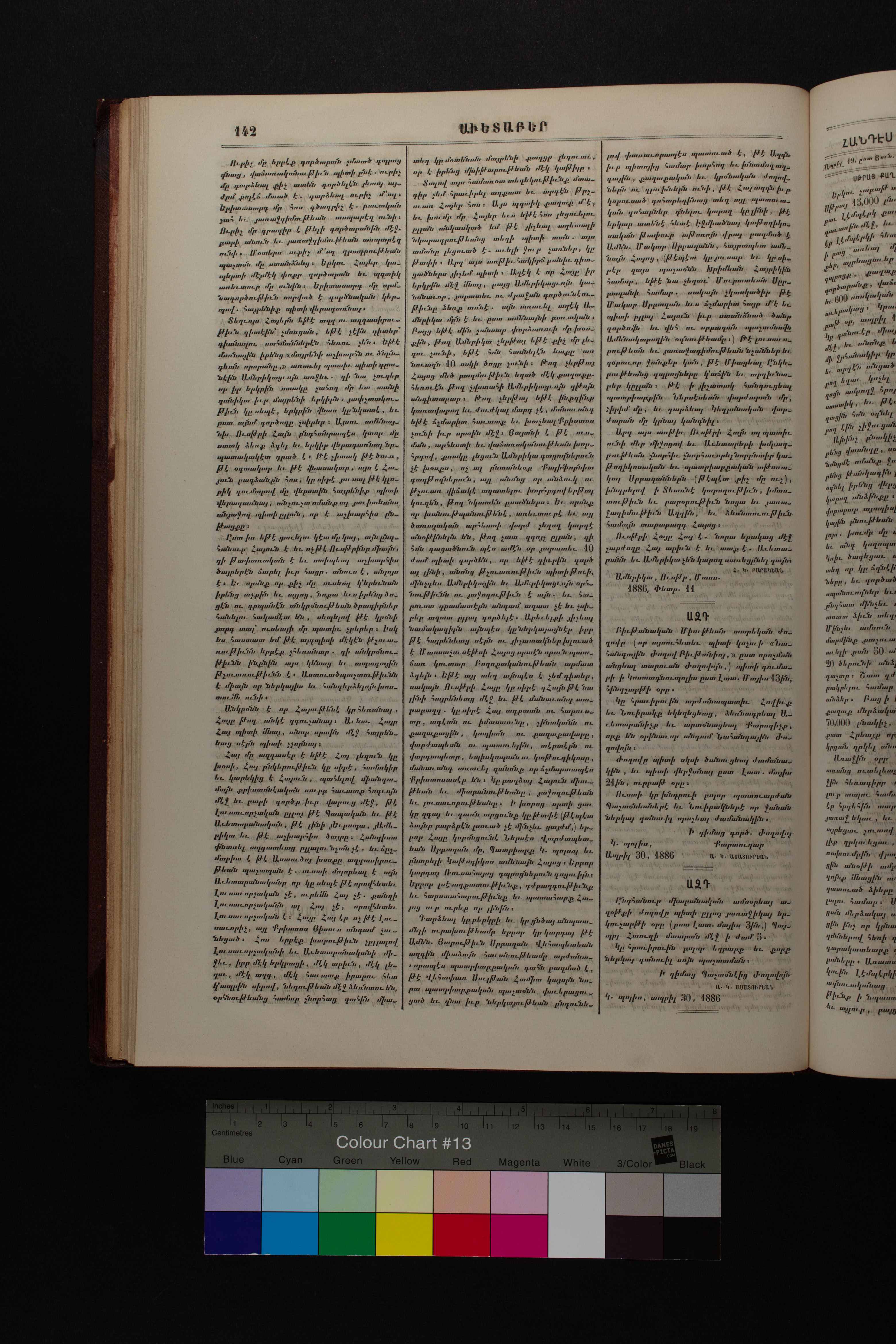 Volume 38-39 (1886) of Avedaper primarily contains articles on Christian religious subjects, ethics, and morals, especially related to the Protestant faith. It reports about happenings and events in the Ottoman Empire’s Armenian Protestant community and includes letters to the editor from contributors located in various cities and towns in Anatolia. Information about the activities of the American Board of Commissioners for Foreign Missions, its personnel, and its schools and other institutions is also presented. It covers local and international political news and includes feature pieces on foreign lands, which offer information about regional history, politics, society, religion, and mission work. It also includes items on a wide range of topics of general interest.