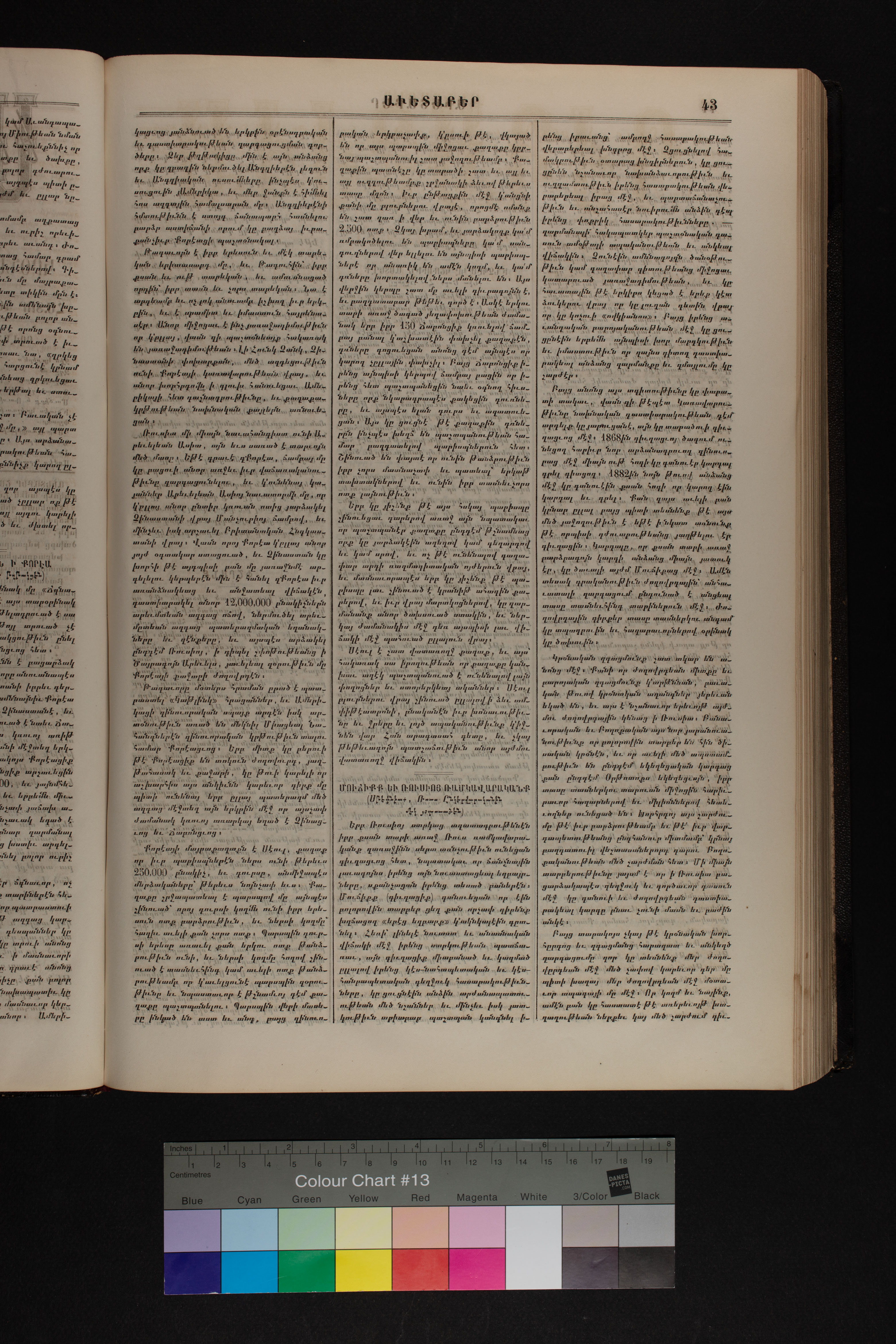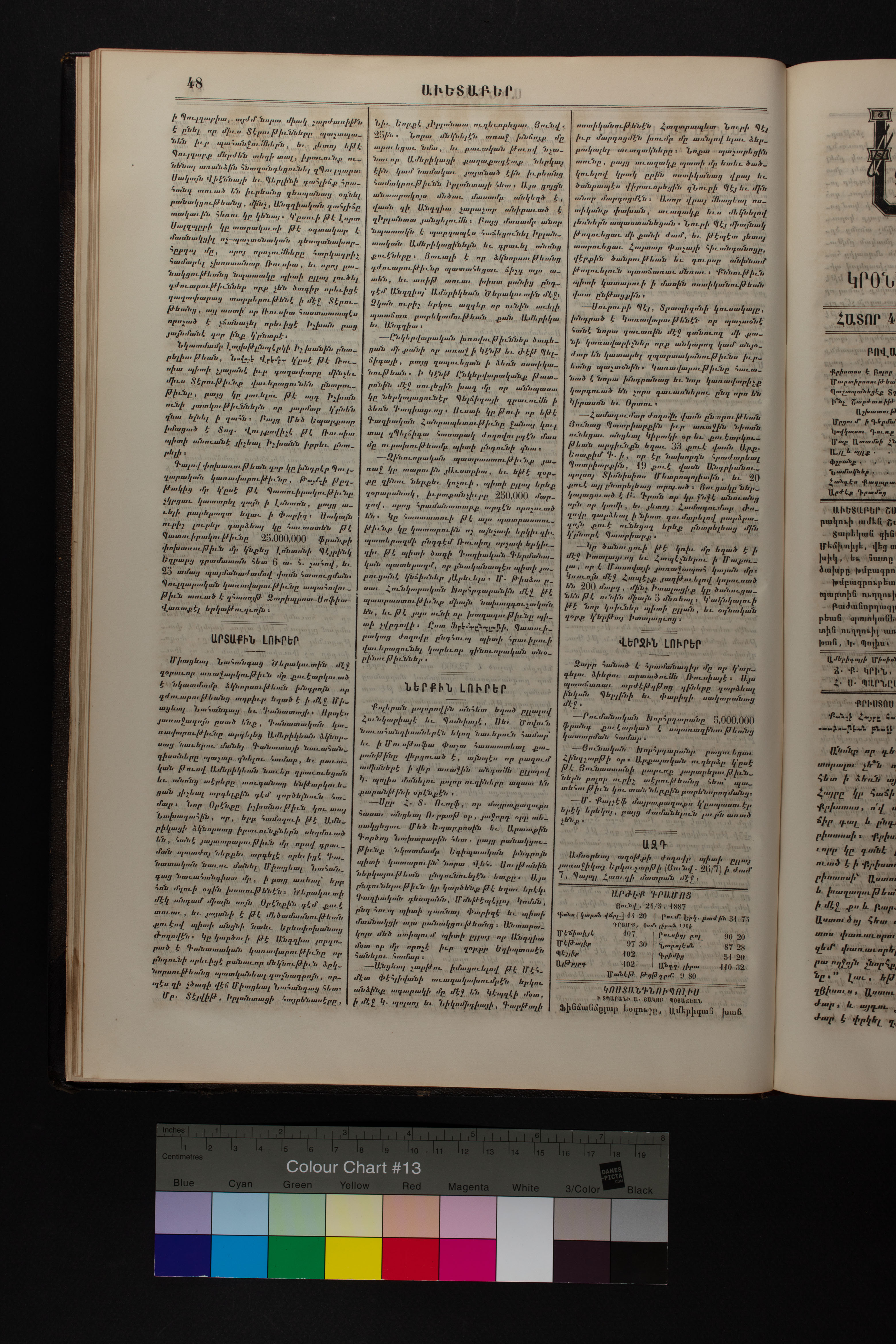 Volume 40 (1887) of Avedaper primarily contains articles on Christian religious subjects, ethics, and morals, especially related to the Protestant faith. It reports about happenings and events in the Ottoman Empire’s Armenian Protestant community and includes letters to the editor from contributors located in various cities and towns in Anatolia. Information about the activities of the American Board of Commissioners for Foreign Missions, its personnel, and its schools and other institutions is also presented. It covers local and international political news and includes feature pieces on foreign lands, which offer information about regional history, politics, society, religion, and mission work. It also includes items on a wide range of topics of general interest, such as health, science, and Mormonism.