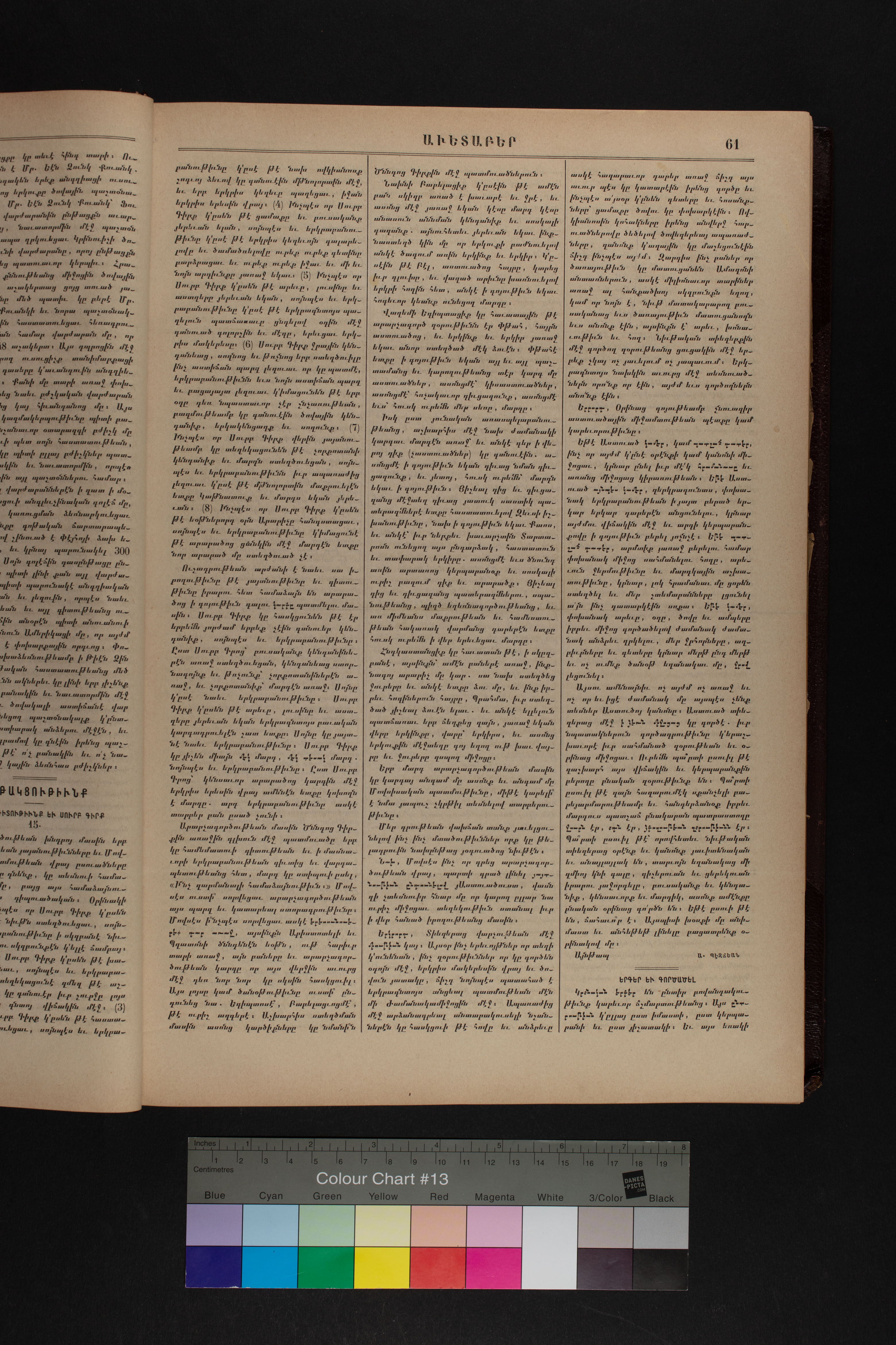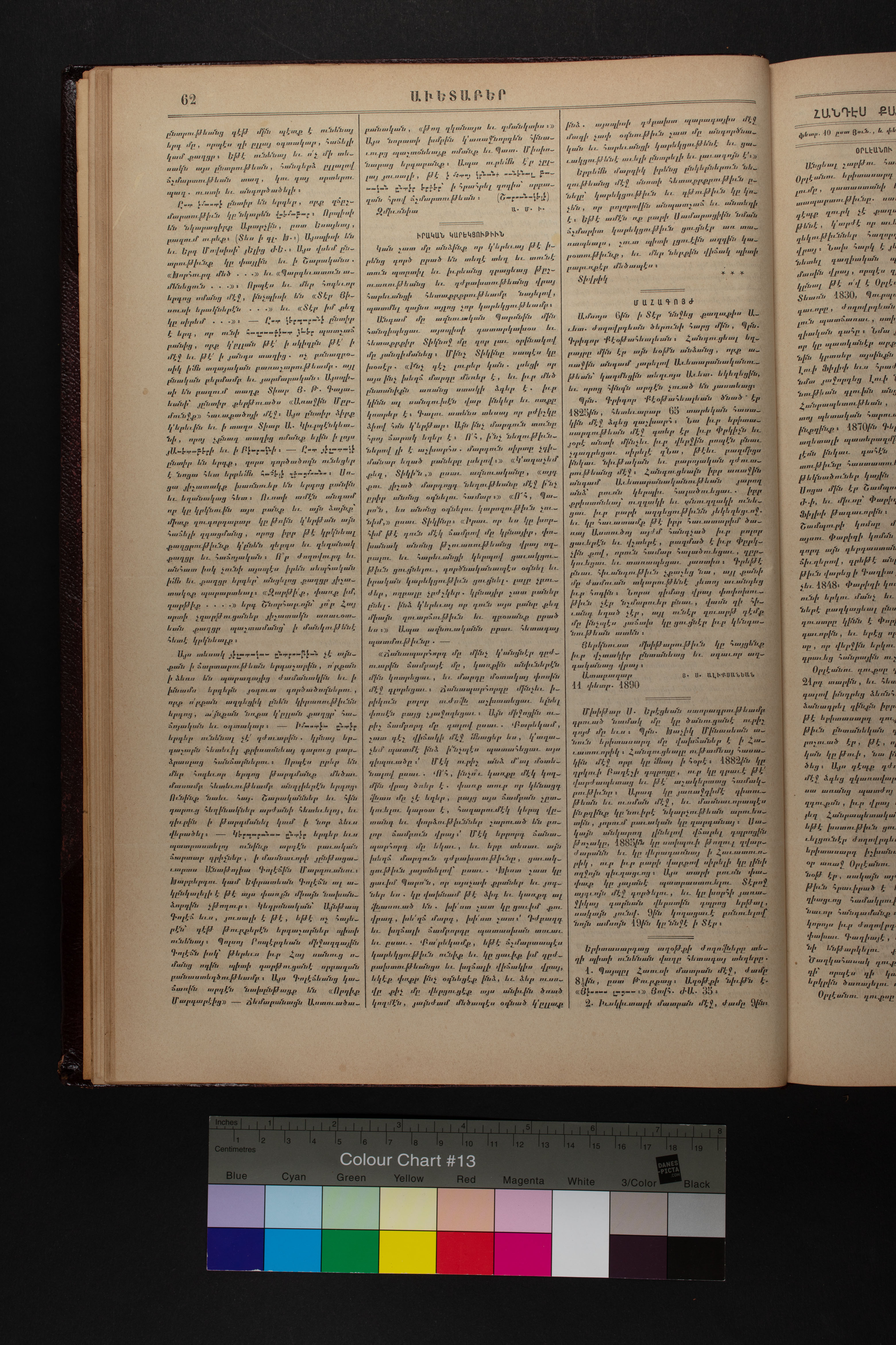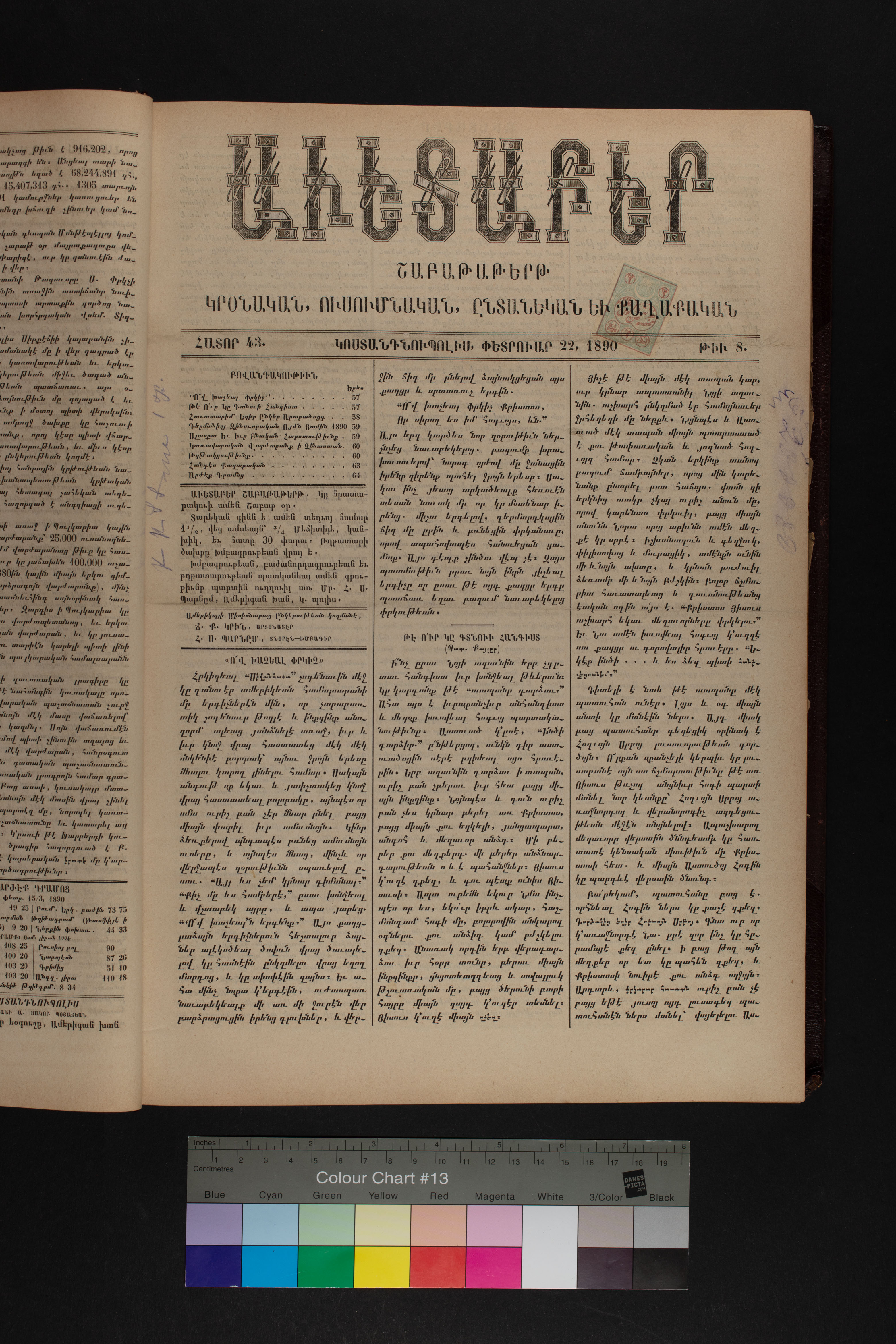 Volume 43 (1890) of Avedaper primarily contains articles on Christian religious subjects, ethics, and morals, especially related to the Protestant faith. It reports about happenings and events in the Ottoman Empire’s Armenian Protestant community and includes letters to the editor from contributors located in various cities and towns in Anatolia. Information about the activities of the American Board of Commissioners for Foreign Missions, its personnel, and its schools and other institutions is also presented. It covers local and international political news and includes feature pieces on foreign lands, which offer information about regional history, politics, society, religion, and mission work. It also includes items on a wide range of topics of general interest.