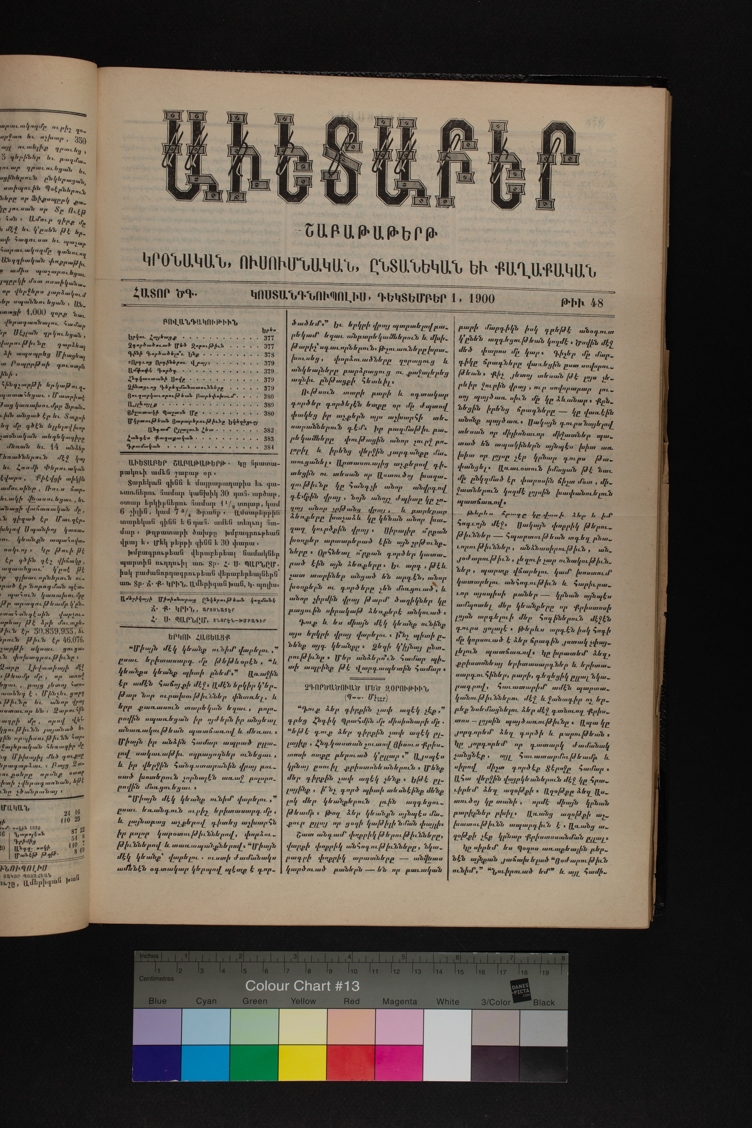 Volume 53 (1900) of Avedaper primarily contains articles on Christian religious subjects, ethics, and morals, especially related to the Protestant faith. It reports about happenings and events in the Ottoman Empire’s Armenian Protestant community and includes letters to the editor from contributors located in various cities and towns in Anatolia. Information about the activities of the American Board of Commissioners for Foreign Missions, its personnel, and its schools and other institutions is also presented. It covers local and international political news and includes feature pieces on foreign lands, which offer information about regional history, politics, society, religion, and mission work. It also includes items on a wide range of topics of general interest, such as turquoise and the Doukhobors, an ethnoreligious group of Russian origin.