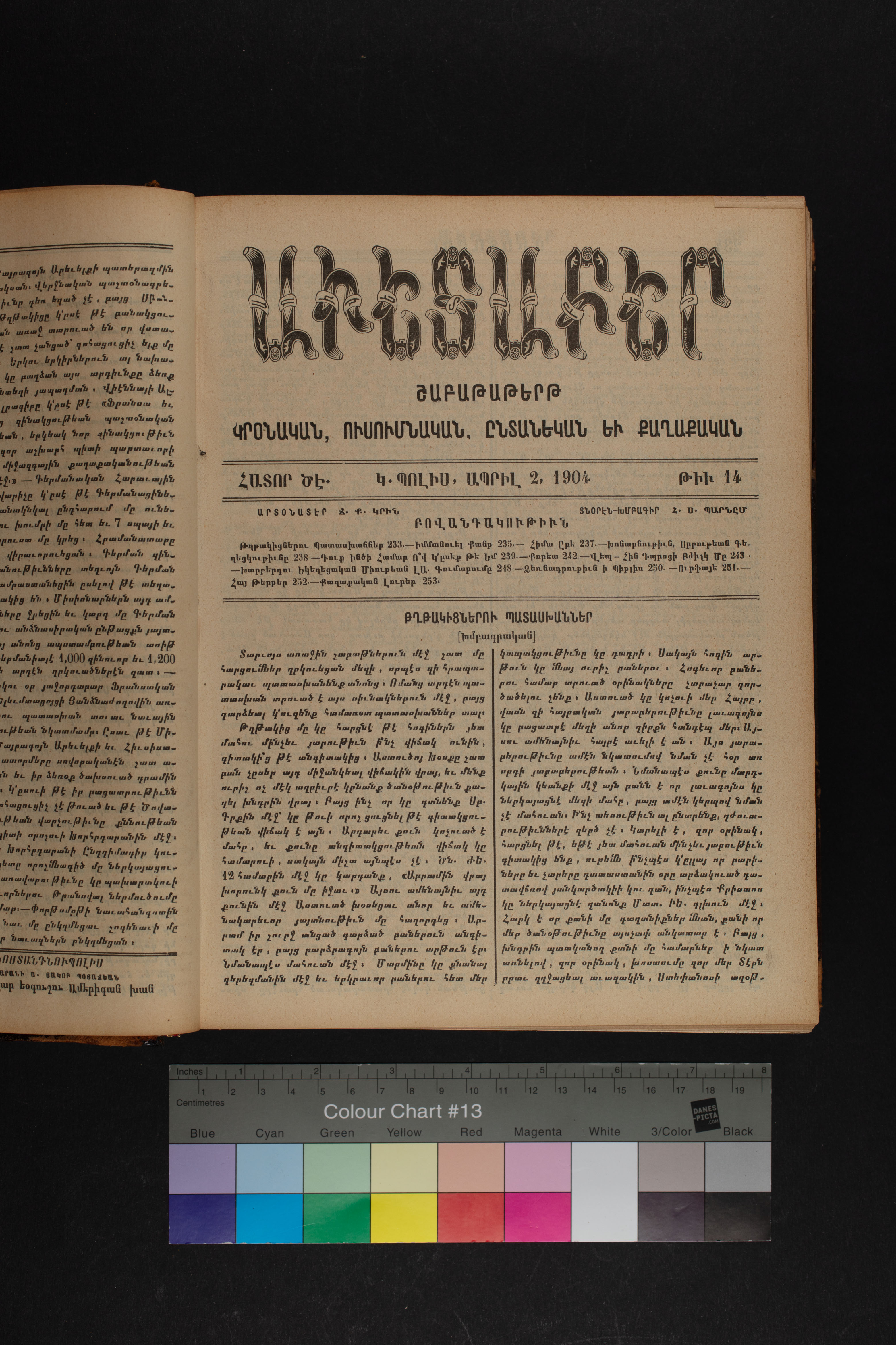 Volume 57 (1904) of Avedaper primarily contains articles on Christian religious subjects, ethics, and morals, especially related to the Protestant faith. It reports about happenings and events in the Ottoman Empire’s Armenian Protestant community and includes letters to the editor from contributors located in various cities and towns in Anatolia. Information about the activities of the American Board of Commissioners for Foreign Missions, its personnel, and its schools and other institutions is also presented. It covers local and international political news and includes feature pieces on foreign lands, which offer information about regional history, politics, society, religion, and mission work. It also includes items on a wide range of topics of general interest, such as Babylonian literature and the Panama Canal.