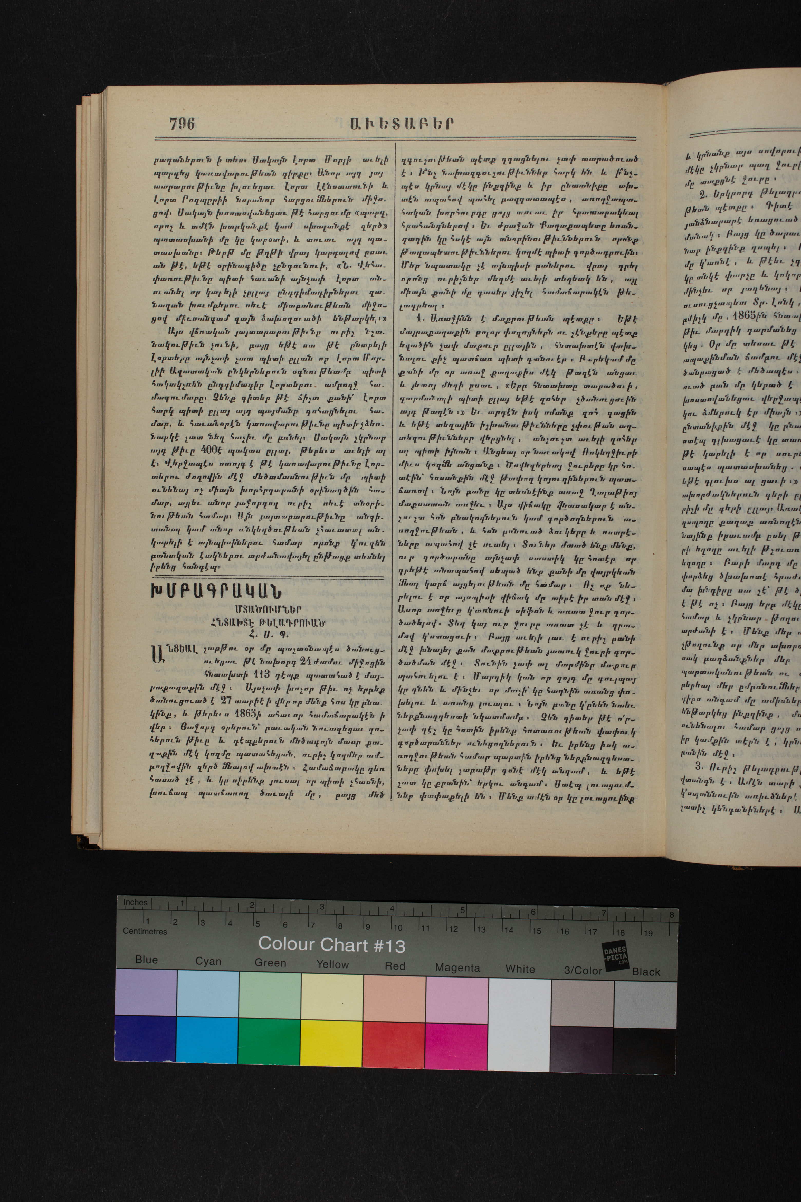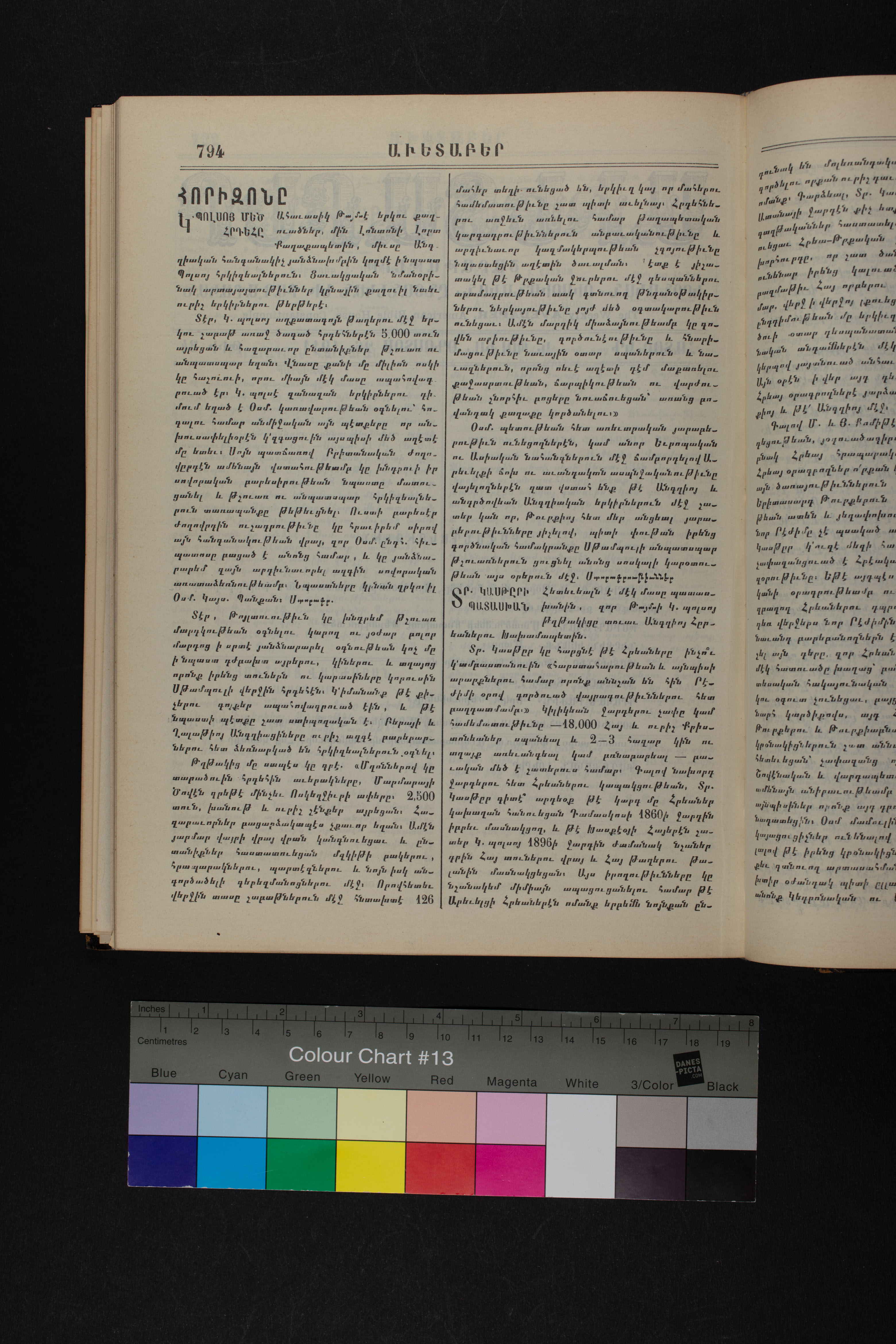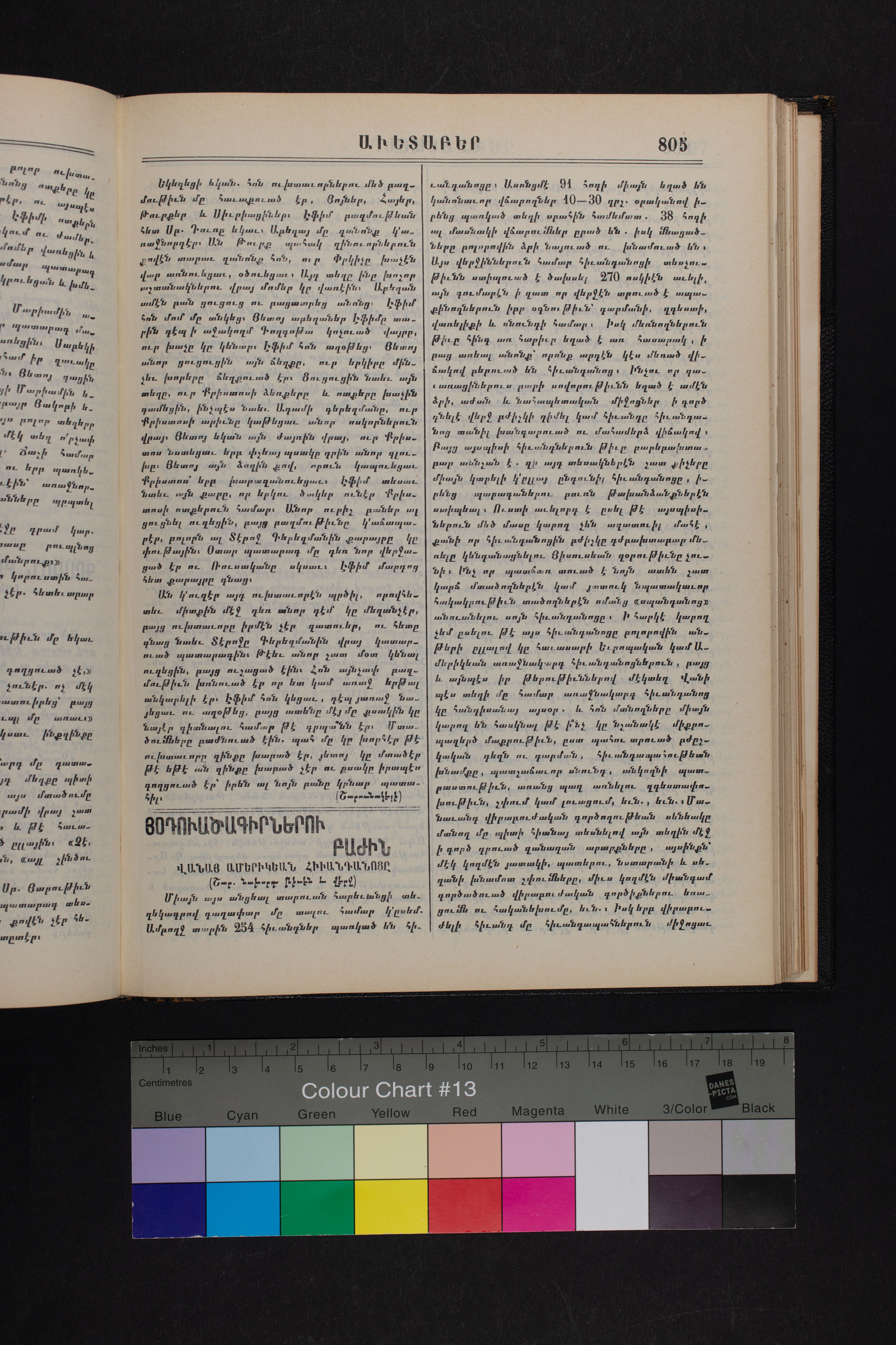 Volume 64 (1911) of Avedaper primarily contains articles on Christian religious subjects, ethics, and morals, especially related to the Protestant faith. It reports about happenings and events in the Ottoman Empire’s Armenian Protestant community and includes letters to the editor from contributors located in various cities and towns in Anatolia. Information about the activities of the American Board of Commissioners for Foreign Missions, its personnel, and its schools and other institutions is also presented. It covers local and international political news and includes feature pieces on foreign lands, which offer information about regional history, politics, society, religion, and mission work. It also includes items on a wide range of topics of general interest. The final issue includes an index.