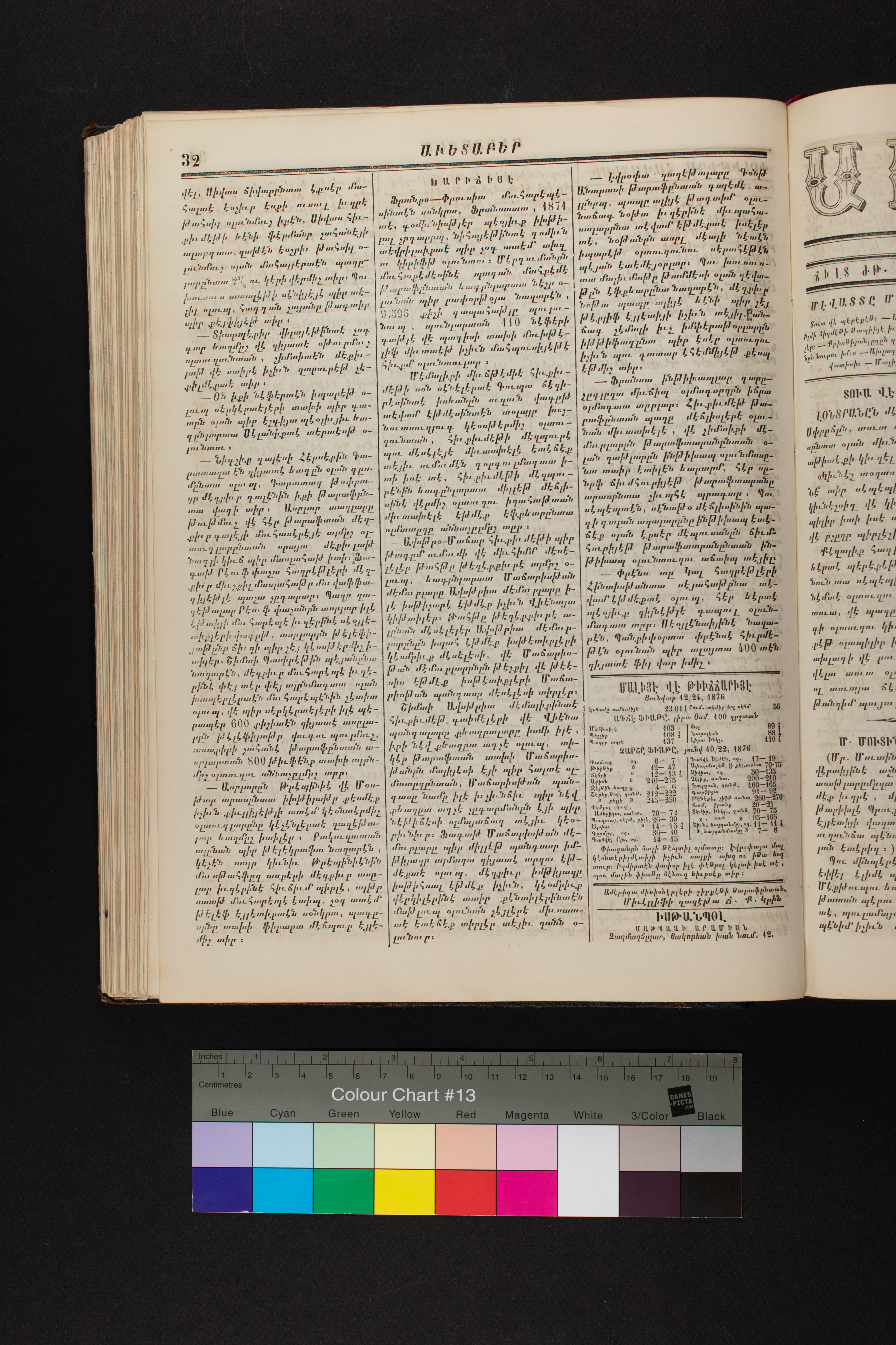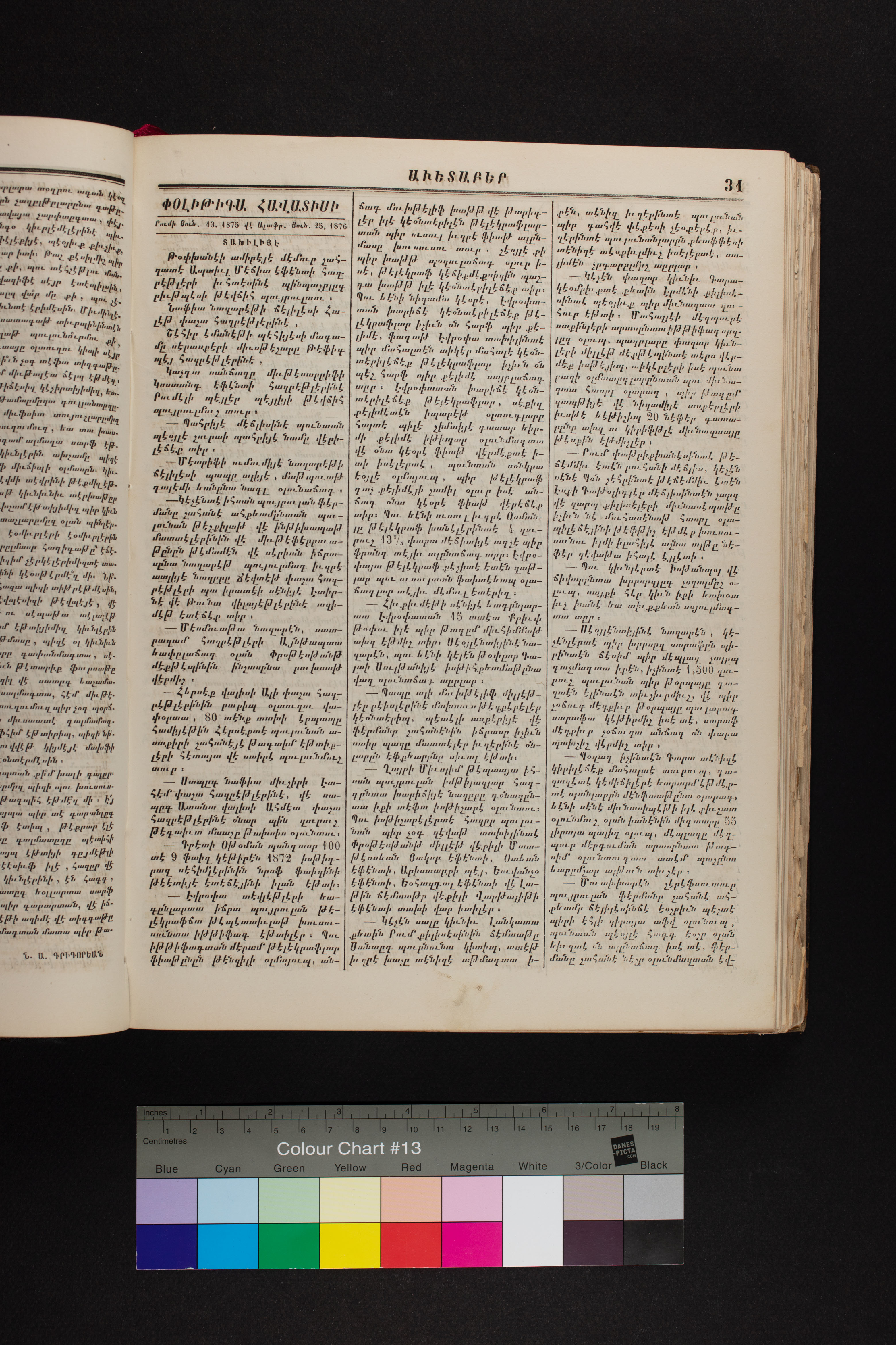 Volume 19 (1876) of of the Armeno-Turkish edition of Avedaper primarily contains articles on Christian religious subjects, ethics, and morals, especially related to the Protestant faith. It reports about happenings and events in the Ottoman Empire’s Armenian Protestant community and includes letters to the editor from contributors located in various cities and towns in Anatolia. Information about the activities of the American Board of Commissioners for Foreign Missions, its personnel, and its schools and other institutions is also presented. It covers local and international political news and includes pieces on foreign lands, which offer information about regional history, politics, society, religion and, mission work. It also includes items on a wide range of topics of general interest.