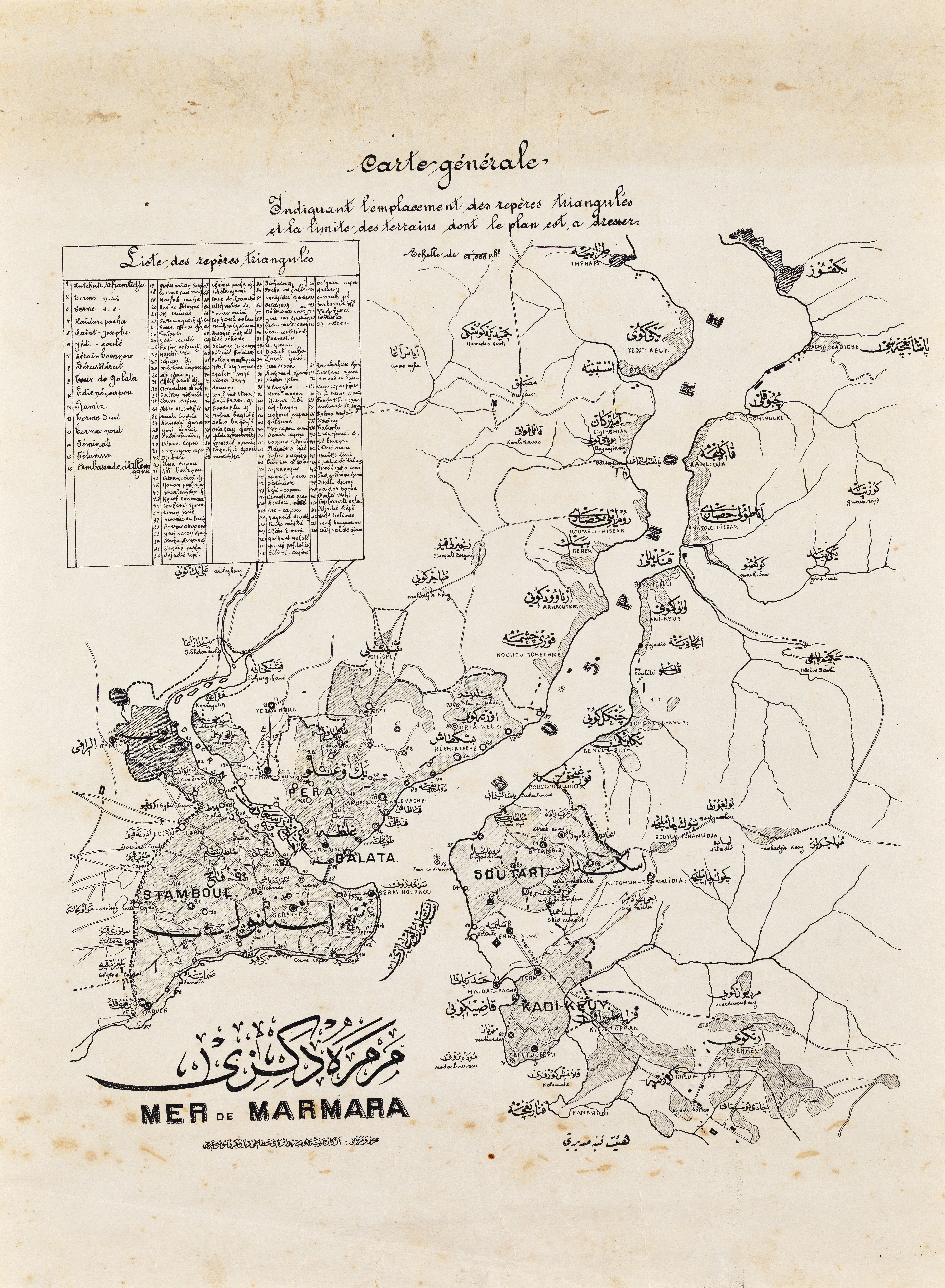 Carte Generale. Indiquant l'emplacement des reperes triangules et la limite des terrains dont le plan est a dresser. - Genel Harita. Nirengi noktalarının konumlarını ve planı çıkarılacak arazilerin sınırını gösterir.