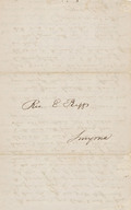 The packet opens with a handwritten note: “Samuel was born in Argos, Greece on the 31st of August 1836, and died in Smyrna Dec. 24th 1844. His death was in consequence of a fall.” Includes a charming letter written in clear printed script from Elias (in Constantinople) to his son (in Bournabal), age seven: “My dear son, I wish to write at least a line for you which you can read. I have many thoughts about you every day, and about your dear sisters, and I try to pray that God will bless you all. You must be very kind to one another and very obedient to mamma especially now that papa is away. Be kind also to Zoe and Elene. I hope they are good girls. Tell Kyra Floro also and Barba Demetri that I remember them too. I think I will write a little letter to Elizabeth next week. Farewell my dear Samuel. Your affectionate papa.” A letter from a [J or L] Lee with a note of blessing for Samuel, then a series of condolence letters upon his death. From W. Goodell: “To think of that beautiful form, first so mangled by the fall, and then put into the ground to be in a short time indistinguished from common dust.” As with the letters related to the deaths of Elizabeth and Emma, all of the condolence letters contain religious explanations or justifications, and assurances that the departed is with God. A particularly thoughtful and introspective letter from M.G. Benjamin expresses condolences upon just having heard the news, but is dated Dec. 6th 1845 (which would be almost an entire year after Samuel’s death on Dec. 24 1844. Likely this is an error, and Benjamin composed the letter on Jan. 6th).